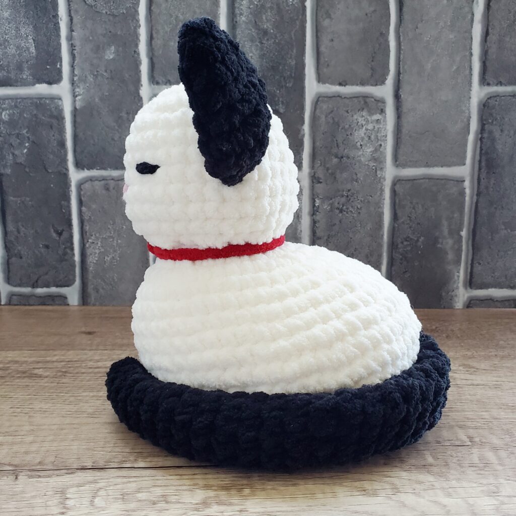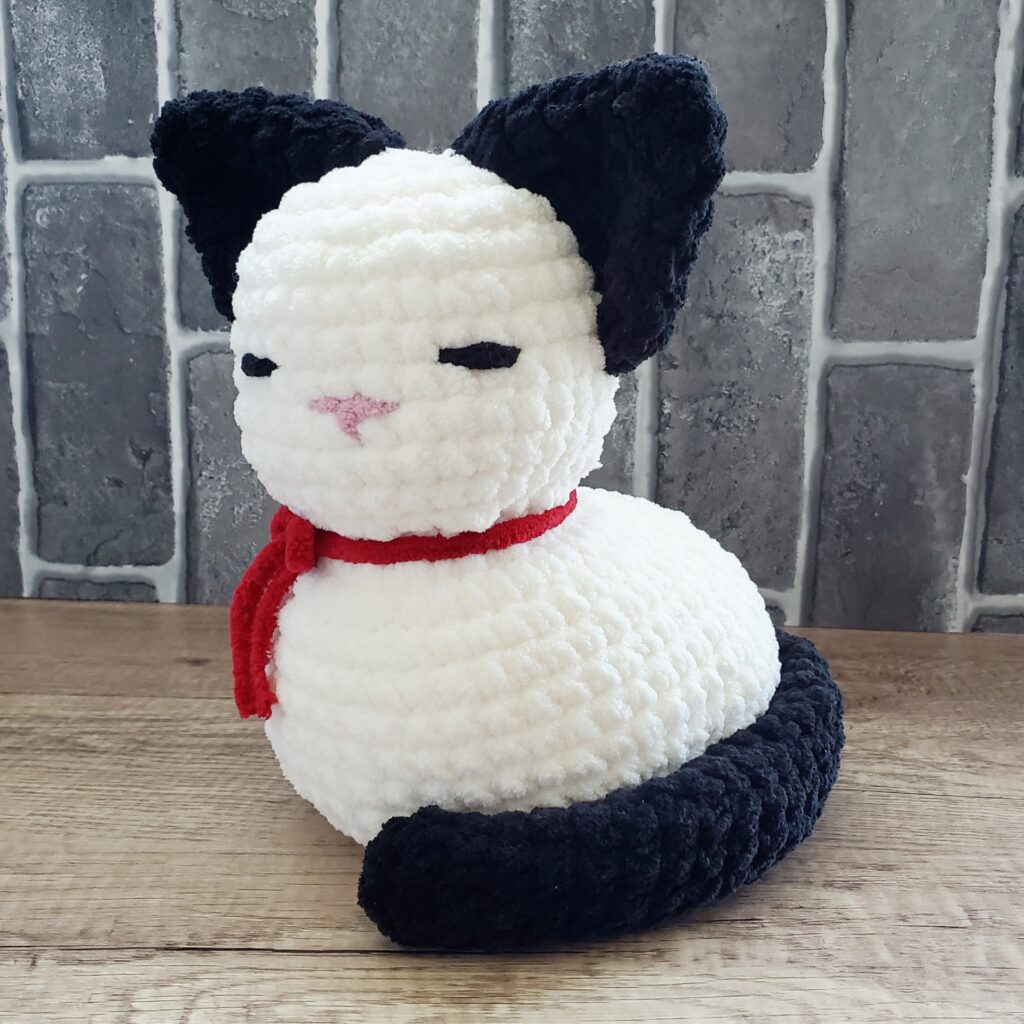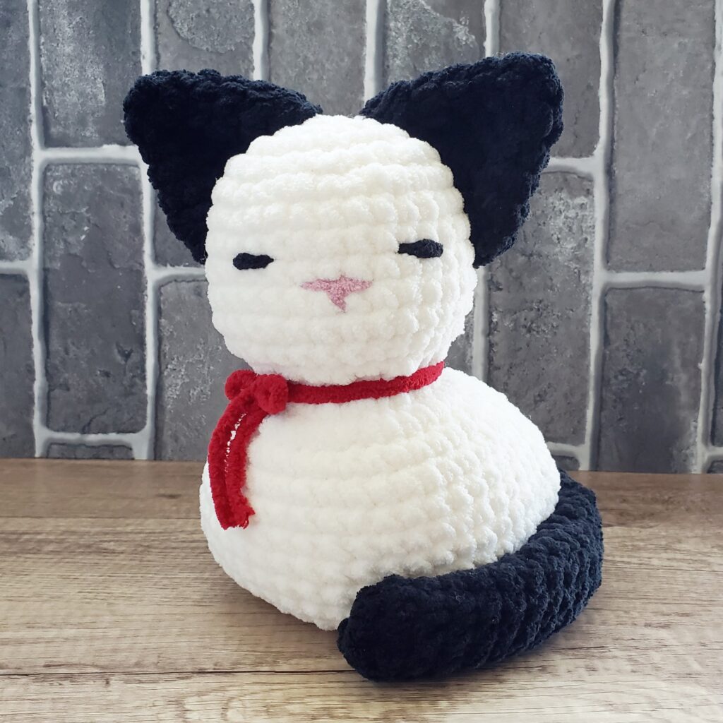Crocheted with Bernat Blanket Super Bulky yarn (#6) and an 8mm hook, this plushie is as squishy as it is stylish. The off white-colored body is accented with coal black details on the ears and curled tail, giving it a classic cat look. And that red bow tie collar? A pop of cozy flair that ties it all together.