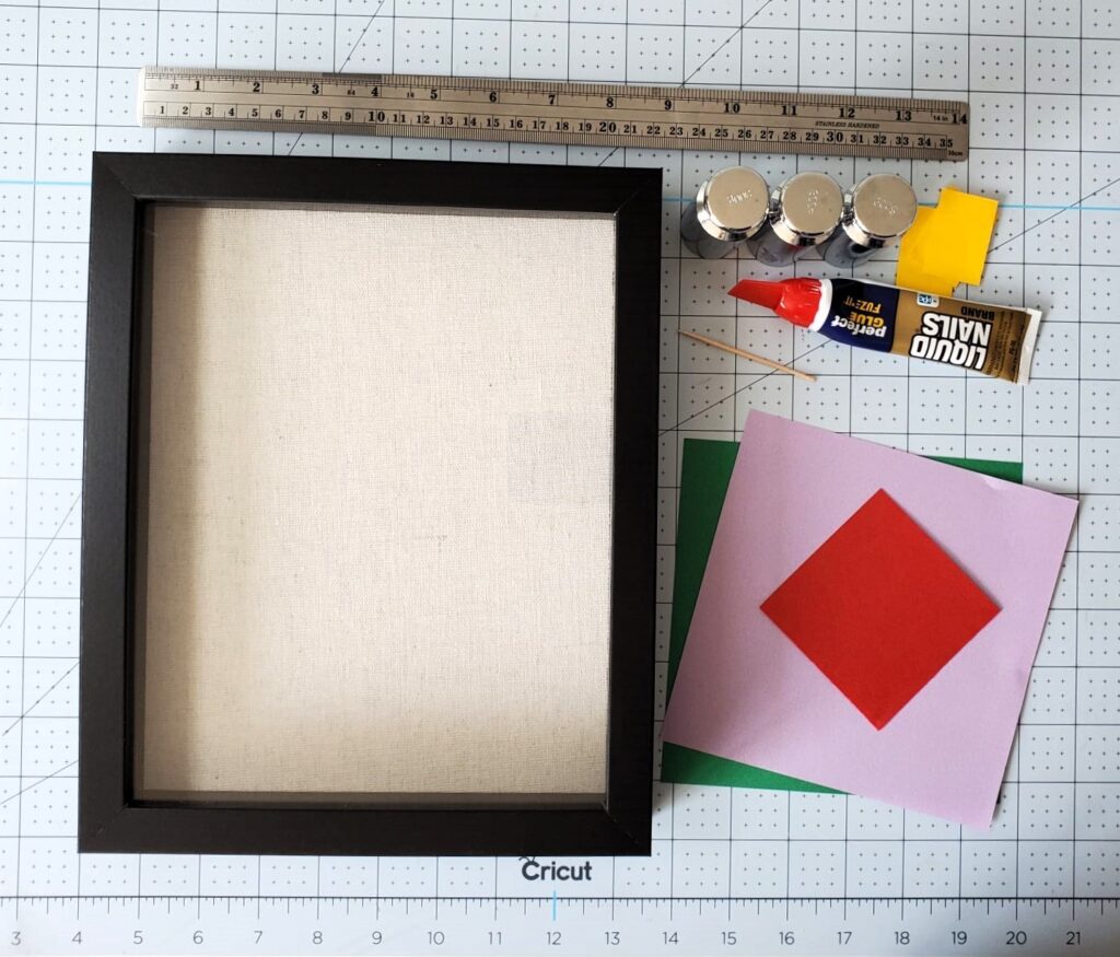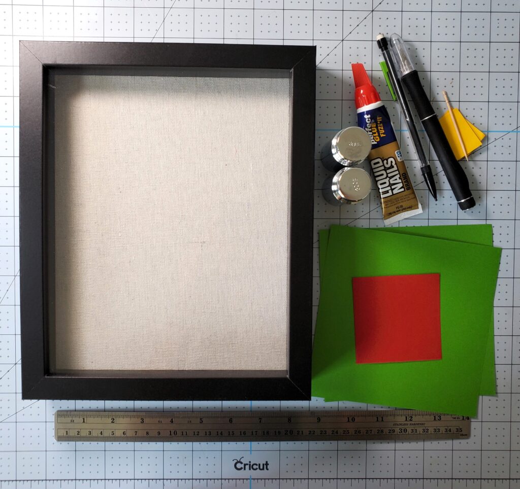 Open the shadowbox and remove the backboard. With the backboard, position the heart slightly above the middle and place the squirrels below on the sides, as shown in the nearing and below pictures. I typically guesstimate their placements, but ensuring they are equal in length. 😅