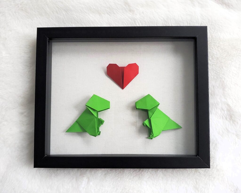 The first step is to create your origami chibi dino t-rexes and heart. Follow these simple and calming tutorials to get started: here and here!
