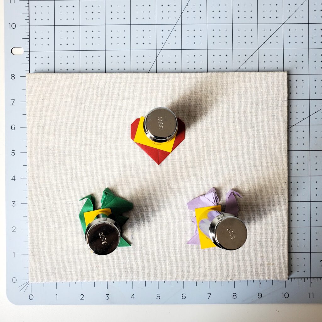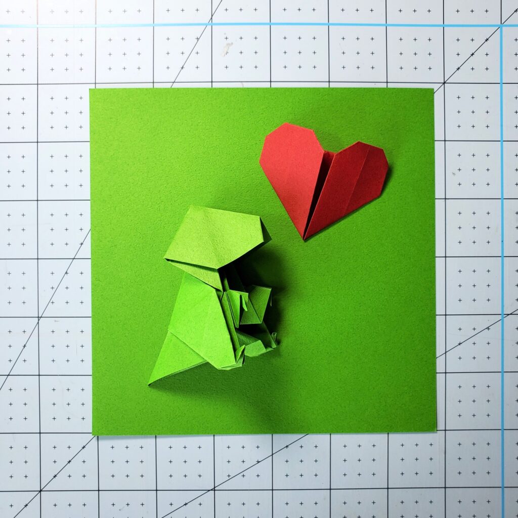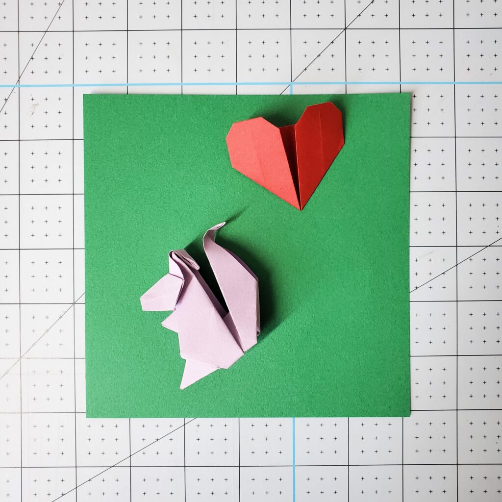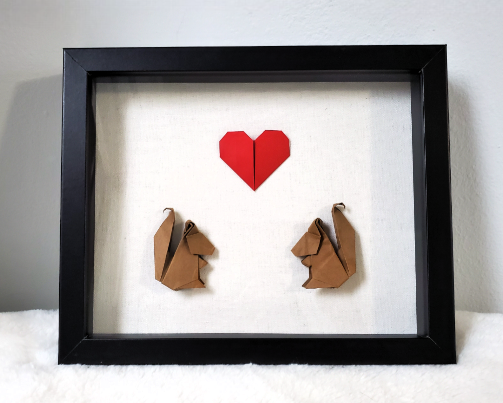 The first step is to create your origami squirrels and heart. Follow these simple and calming tutorials to get started: here and here!