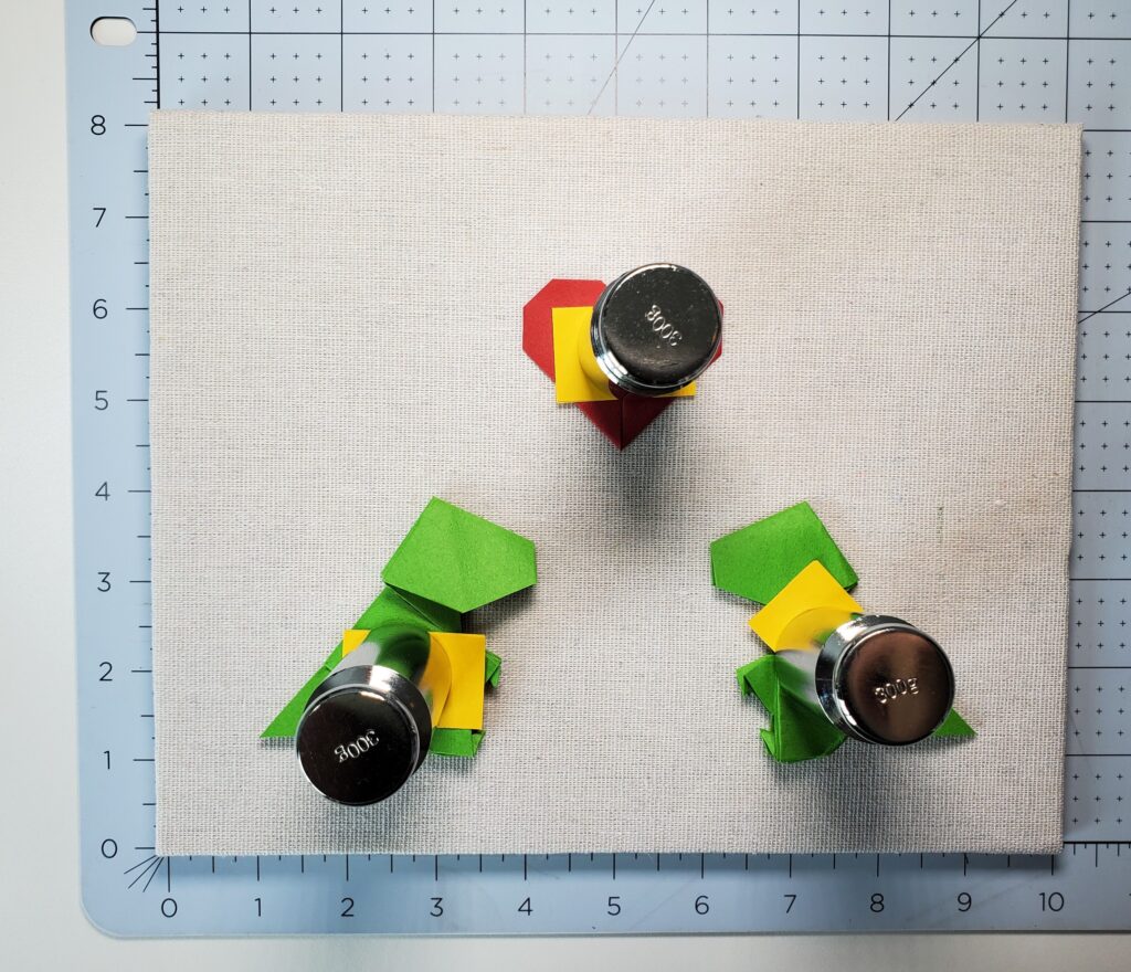Using a toothpick, apply a small dab of Liquid Nails glue under the heart. Cover the heart with a sticky note and place a weight on top to hold it in place while it dries. Repeat this process for the squirrels: apply glue behind them, cover with sticky notes, and place weights on top. Allow the glue to dry completely. I typically wait 1 hour minimum.