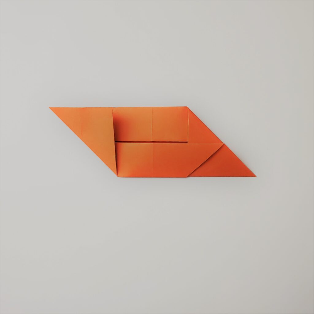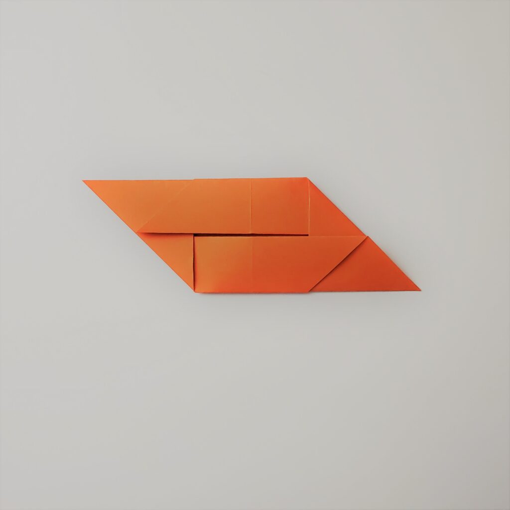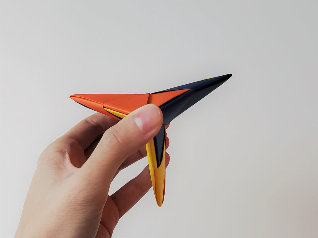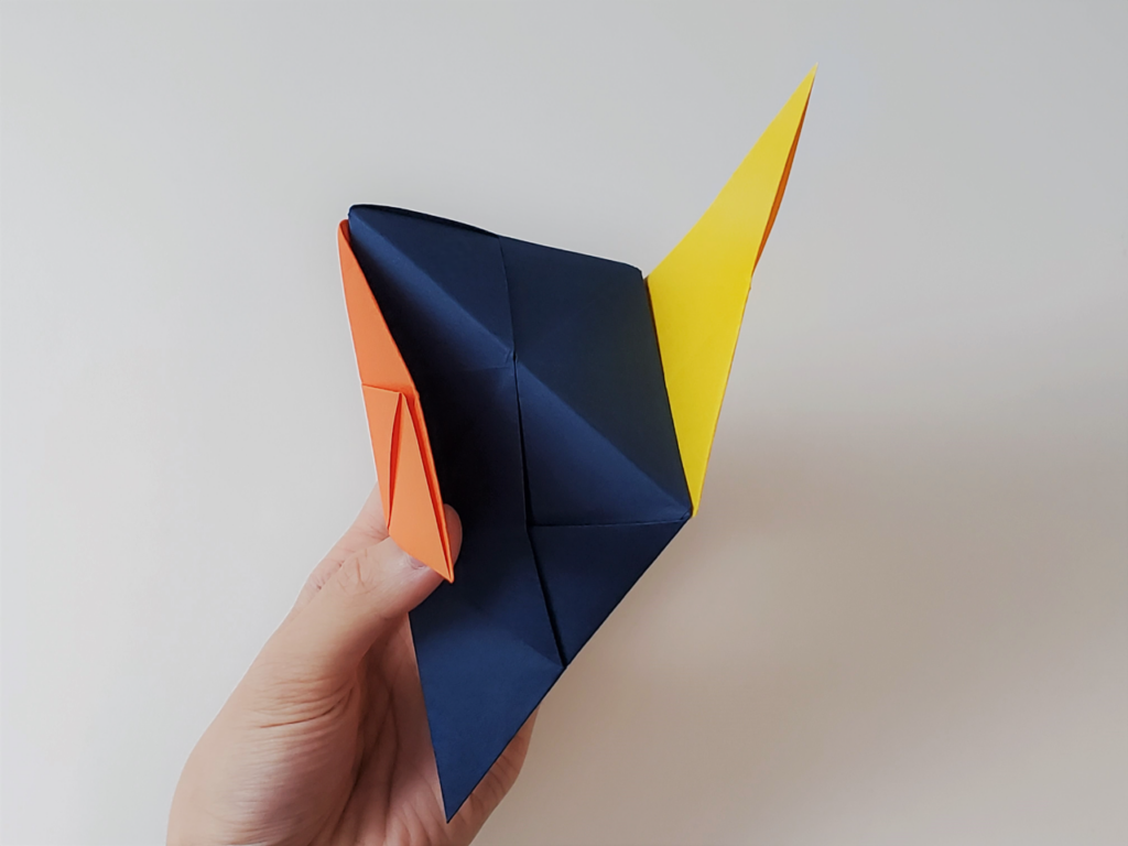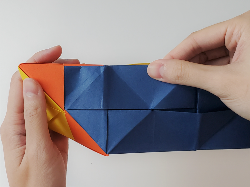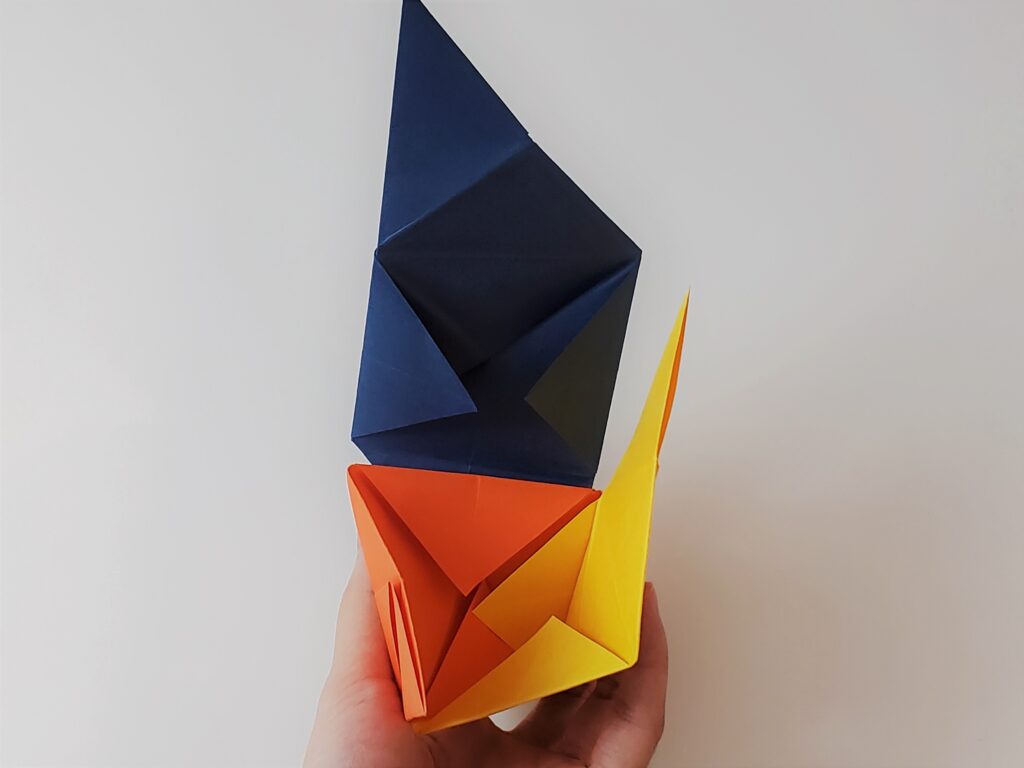 Fold the Blue unit’s remaining flap down towards you. Using the Orange unit’s corner, insert it in the Blue unit’s inner triangle panel on the bottom right. Pinch the sides to shape the combined unit.