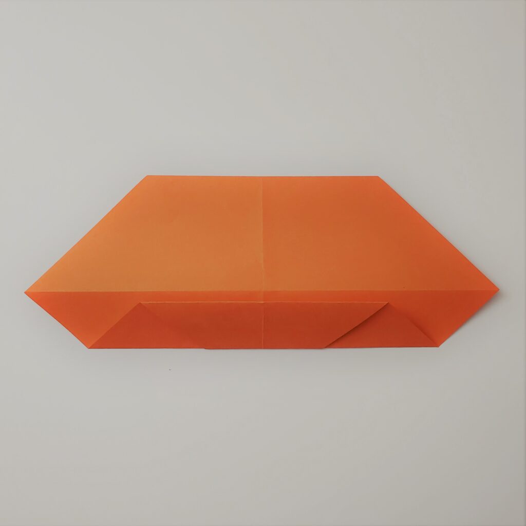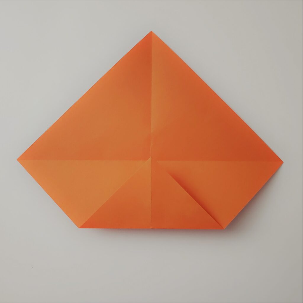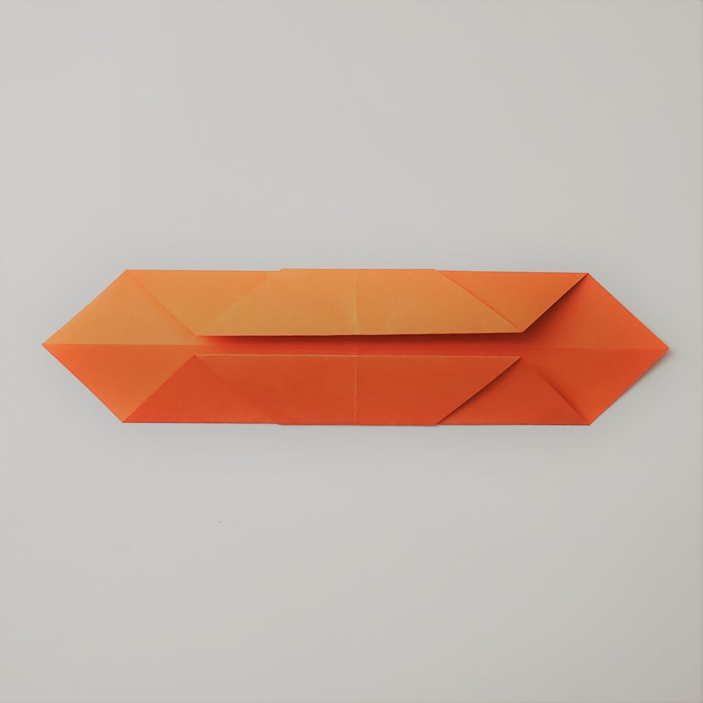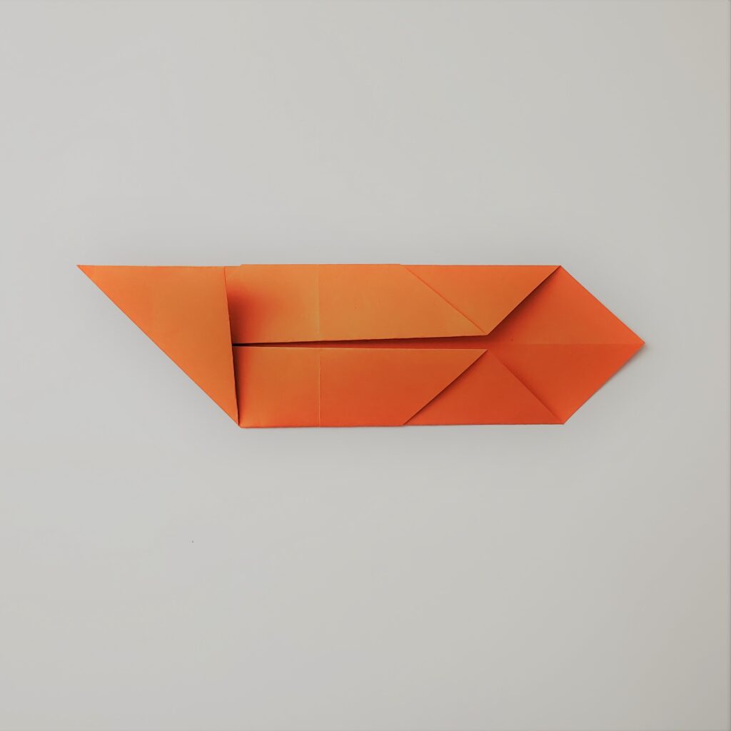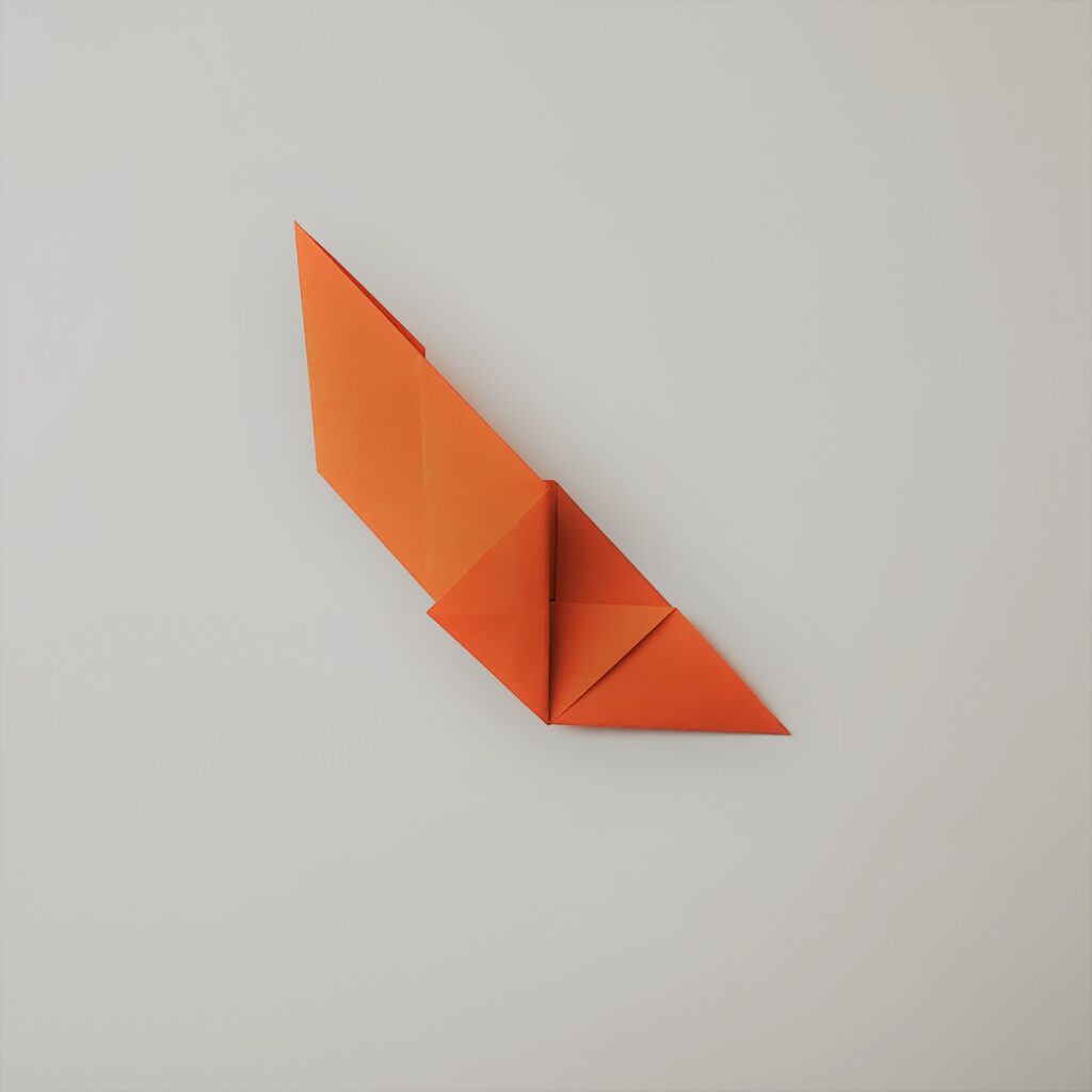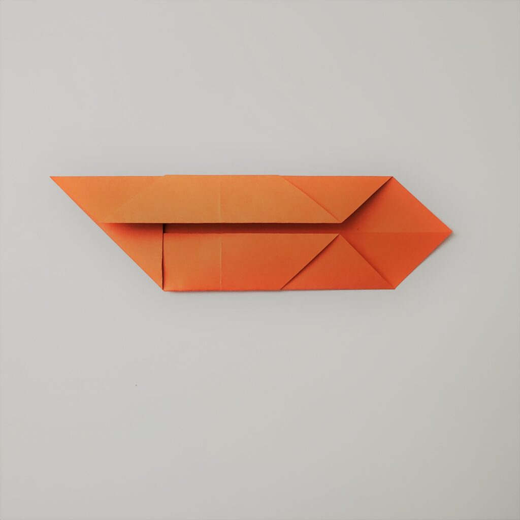 Fold the Blue unit’s remaining flap down towards you. Using the Orange unit’s corner, insert it in the Blue unit’s inner triangle panel on the bottom right. Pinch the sides to shape the combined unit.