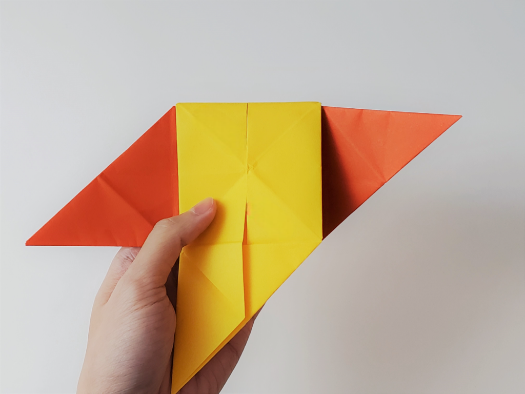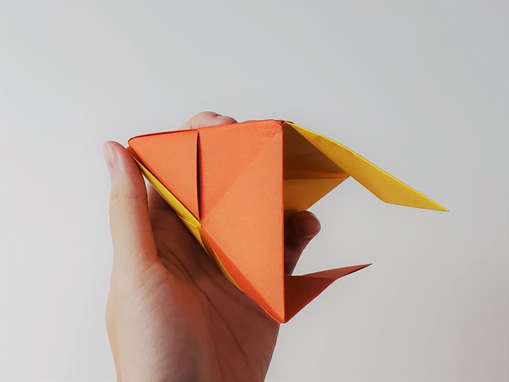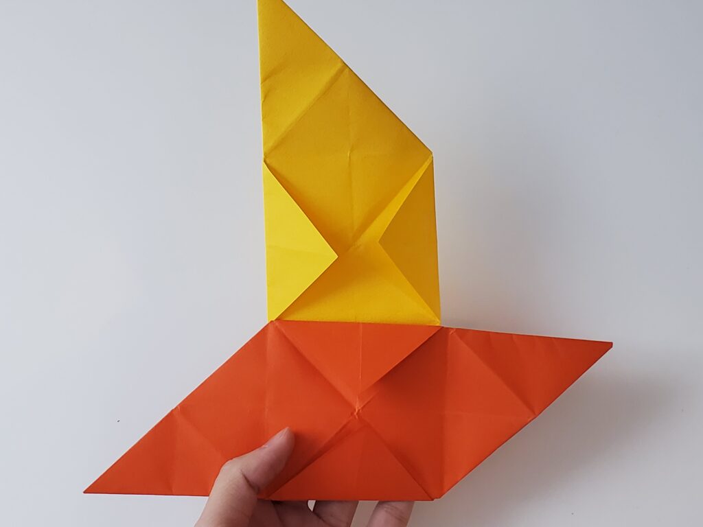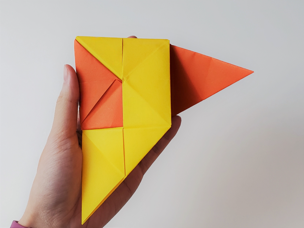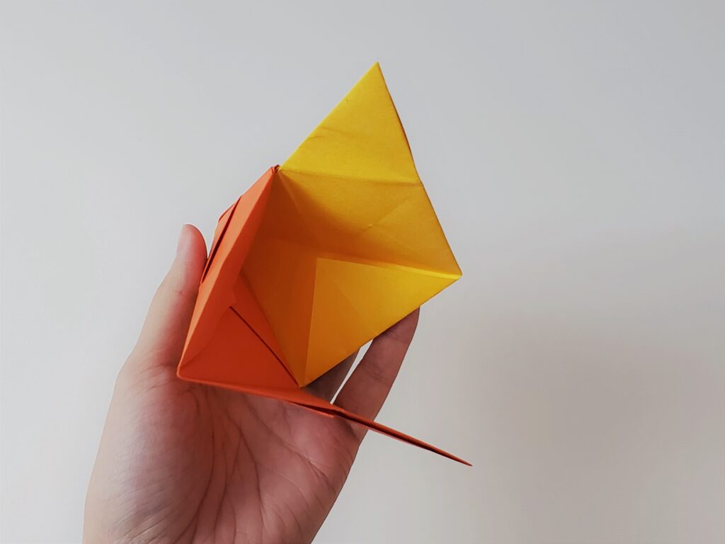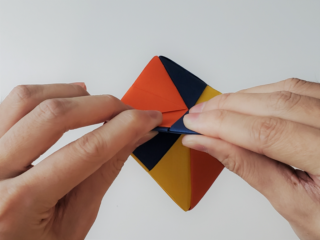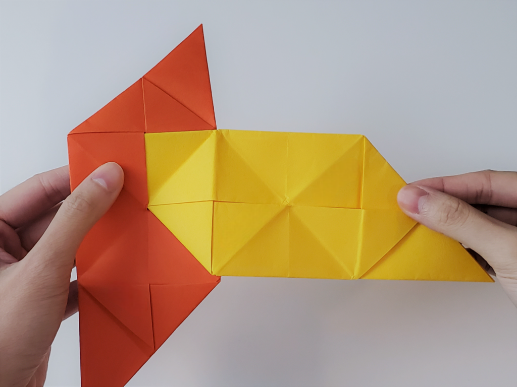 Fold the Yellow unit’s remaining flap down towards you. Using the Orange unit’s left corner, insert it in the Yellow unit’s inner triangle panel on the bottom right. Pinch the sides to shape the combined unit.