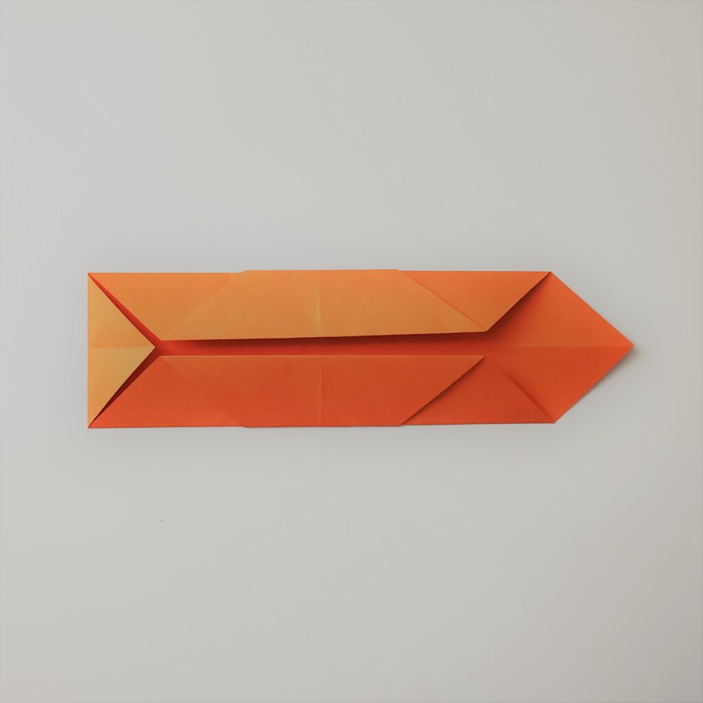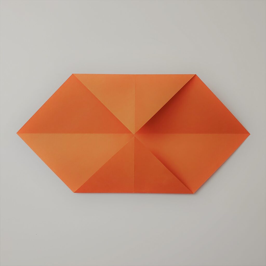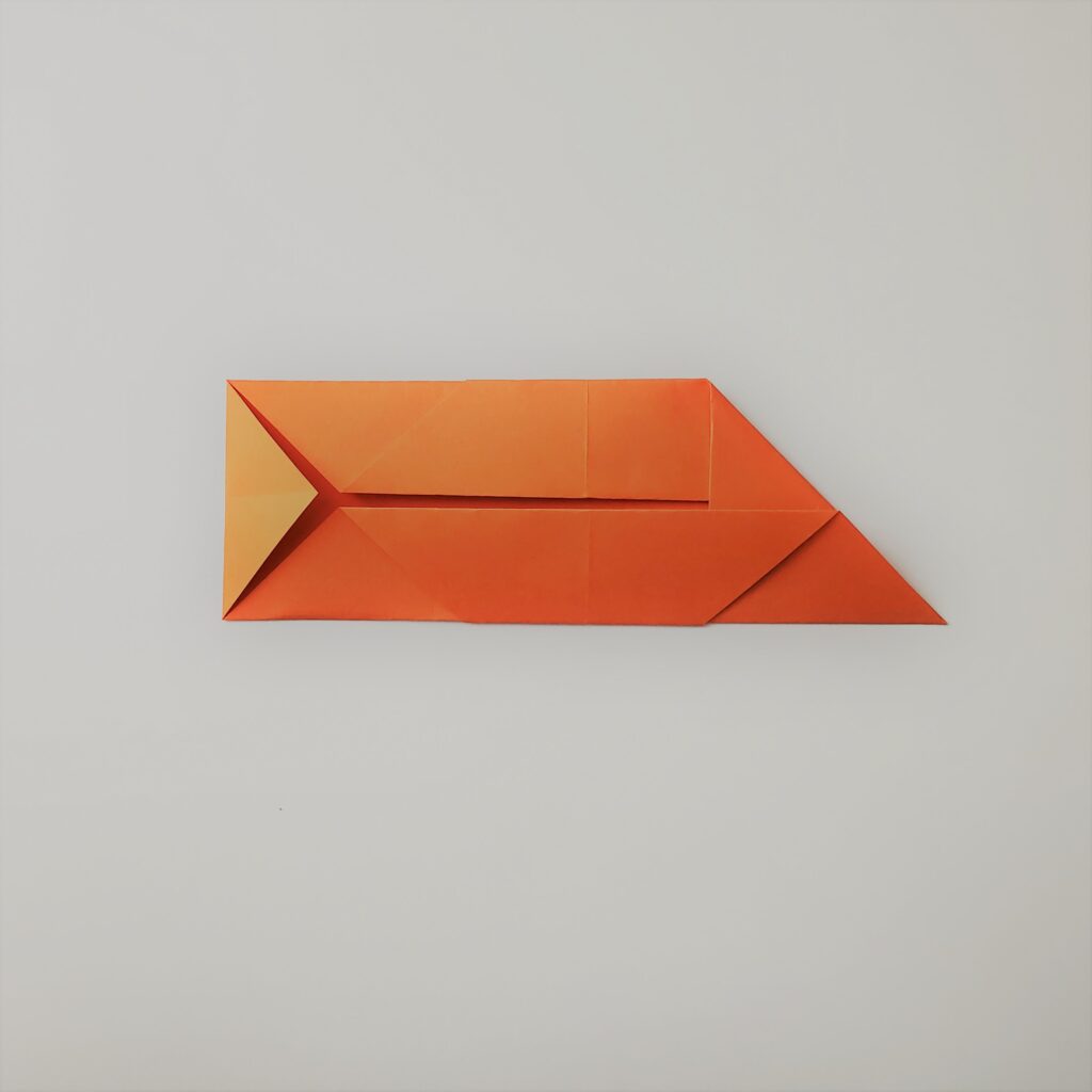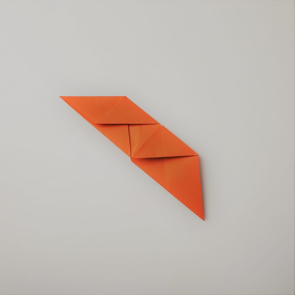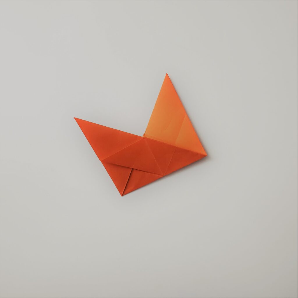 Fold the Yellow unit’s remaining flap down towards you. Using the Orange unit’s left corner, insert it in the Yellow unit’s inner triangle panel on the bottom right. Pinch the sides to shape the combined unit.