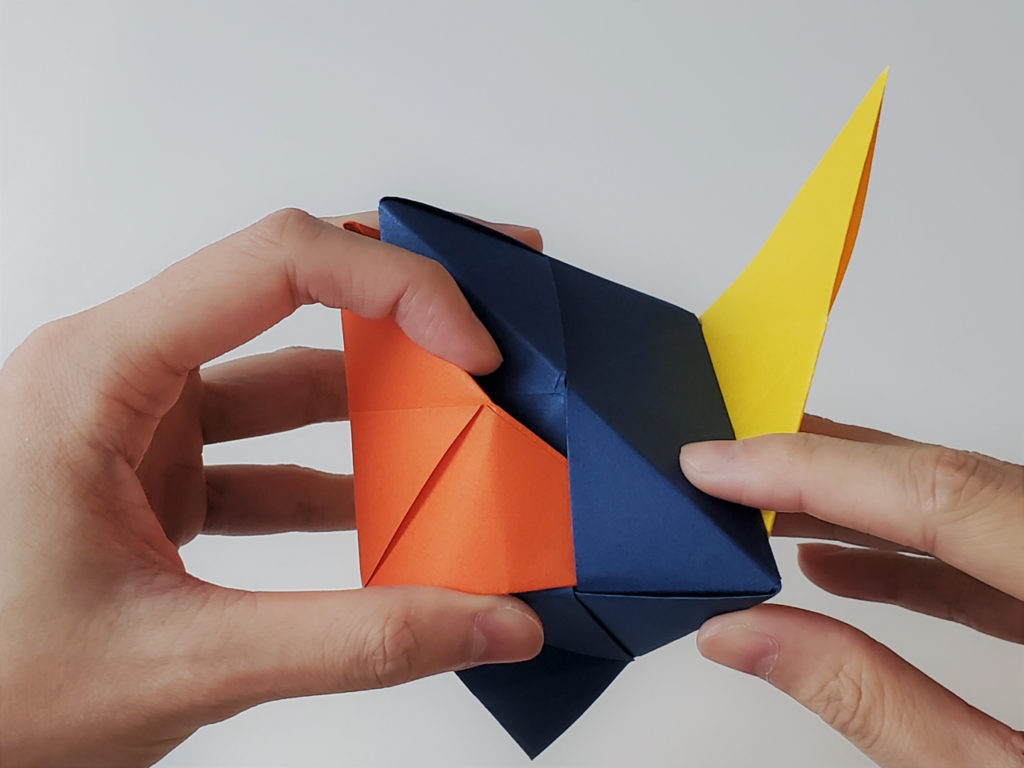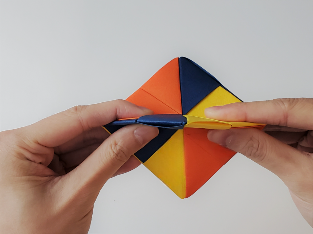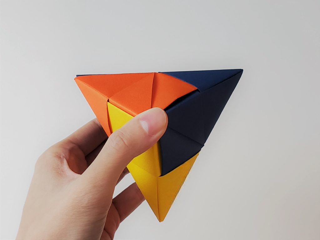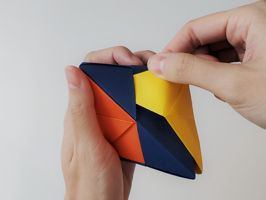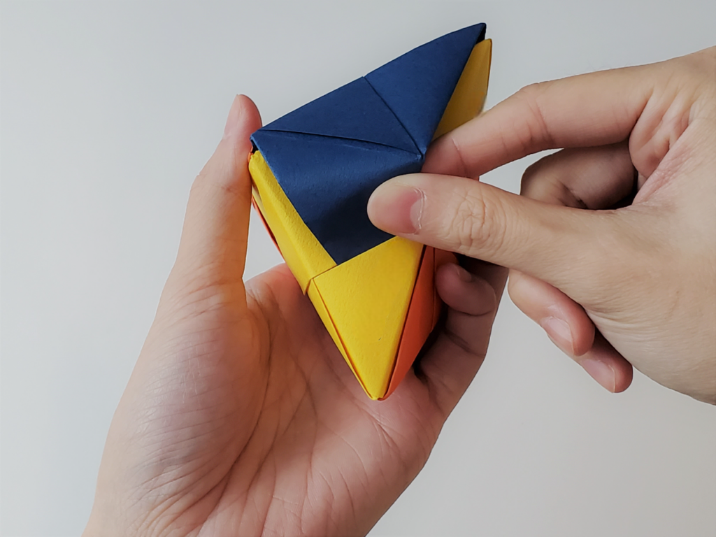 Using the Yellow unit’s corner, insert it in the Blue unit’s inner triangle panel on the top left. Pinch the sides to shape the combined unit.