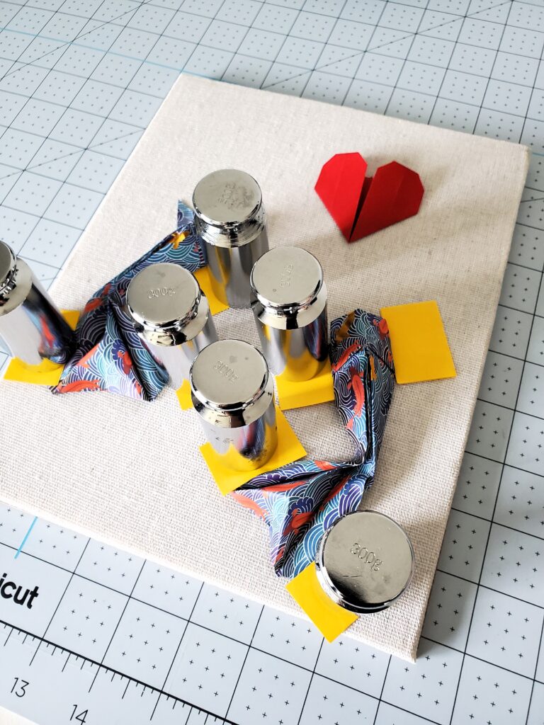 Using a toothpick, apply a small dab of Liquid Nails glue under the heart. Cover the heart with a sticky note and place a weight on top to hold it in place while it dries. Repeat this process for the koi fish: apply glue under the fins and tail, cover with sticky notes, and place weights on top. Allow the glue to dry completely. I typically wait 1 hour minimum.