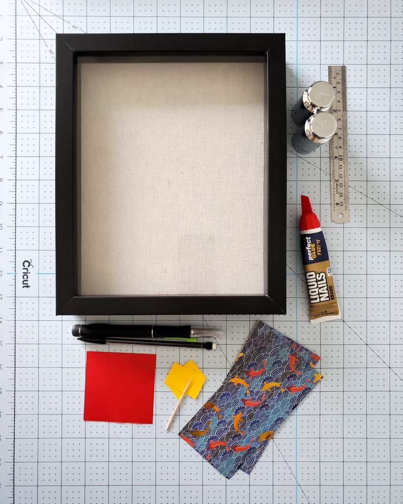Open the shadowbox and remove the backboard. With the backboard, position the heart in the top right corner and place the koi fish next to it, as shown in the picture. I typically guesstimate their placements. 😅