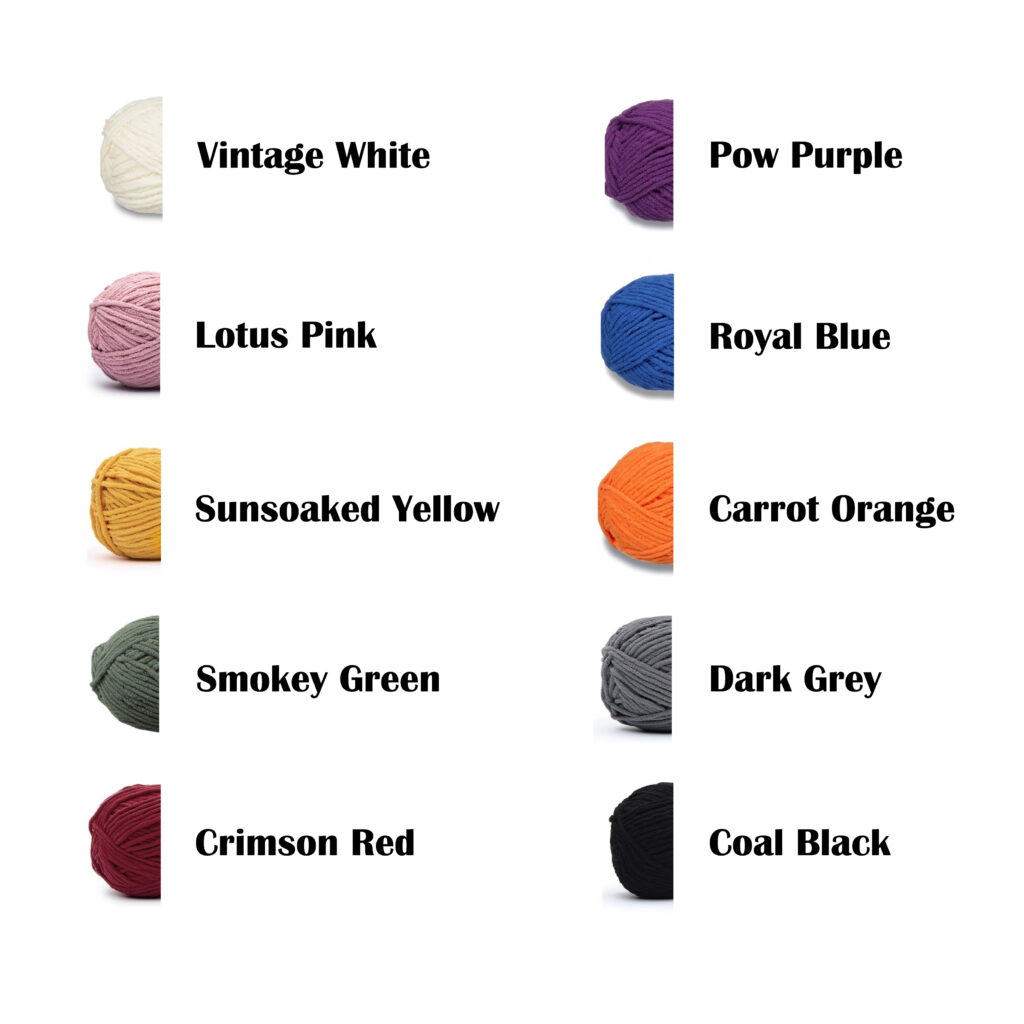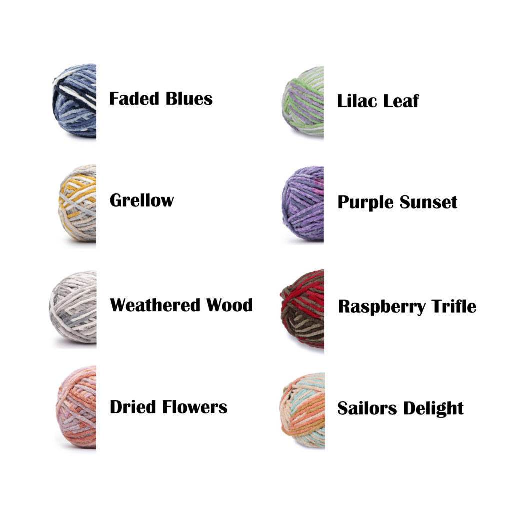 - Yarn: Bernat Blanket Super Bulky yarn (#6) – see above colors