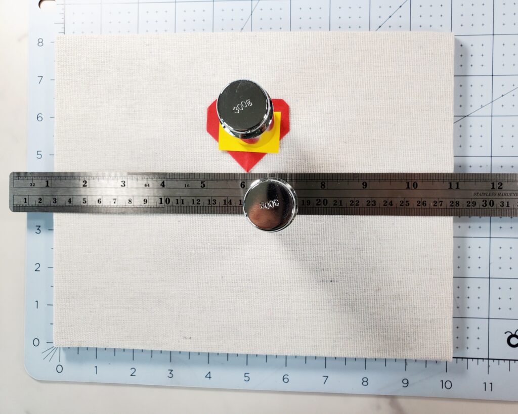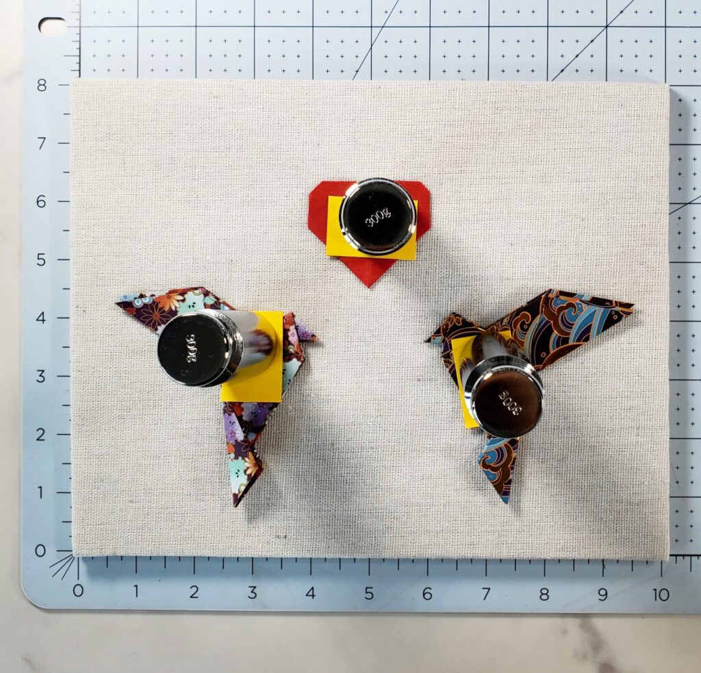 Using a toothpick, apply a small dab of Liquid Nails glue under the heart. Cover the heart with a sticky note and place a weight on top to hold it in place while it dries. Repeat this process for the doves: apply glue behind them, cover with sticky notes, and place weights on top. Allow the glue to dry completely. I typically wait 1 hour minimum.